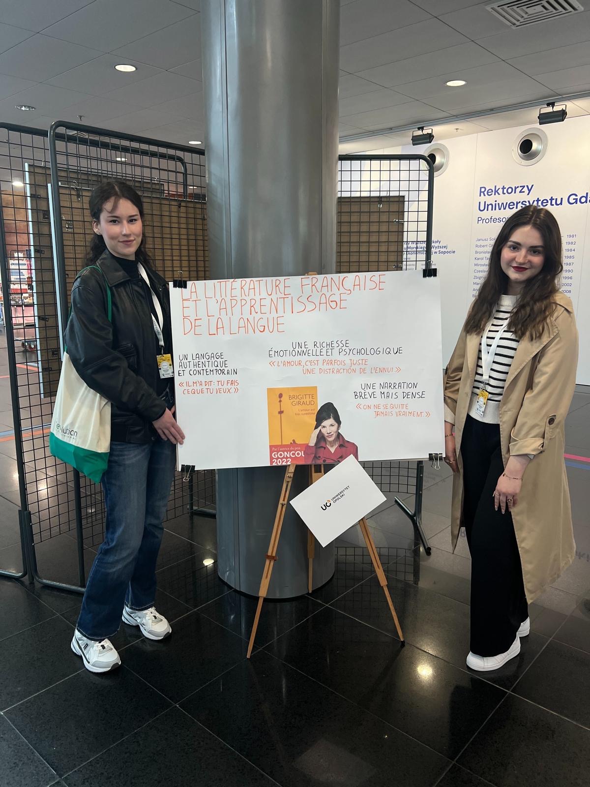 W dniach 21-23 maja Panie Oliwia Chwedeczko i Joanna Kiedos, studentki 3.roku Filologii romańskiej od podstaw, wzięły udział w finale tegorocznej edycji projektu FLEvolution (https://flevolution.eu/cms/), organizowanego przez Instytut Romanistyki Uniwersytetu Gdańskiego, Uniwersytet w Innsbrucku oraz Maison des écrivains et de la littérature. Instytut Nauk o Literaturze UO jest partnerem projektu, w który włączone są również inne uczelnie z Polski, Francji i Austrii. Celem projektu jest stworzenie bazy interaktywnych ćwiczeń do nauki języka francuskiego, opartych na utworach literackich. Majowy finał, który odbywa się na w Gdańsku to seria warsztatów, koncertów, oraz spotkań, w tym z autorem/autorką dzieł, na podstawie których tworzone są ćwiczenia w danym roku. W edycji 2025 jest to Brigitte Giraud (L’amour est très surestimé – 2007 ; Avoir un corps – 2013 ; Vivre vite – 2022). Jednym z elementów programu jest również sesja posterowa, podczas której uczestnicy i uczestniczki przedstawiają przygotowane przez siebie postery na tematy ich własnych refleksji związanych z pracą z tekstem literackim w perspektywie nauczania języka obcego i tworzenia materiałów dydaktycznych.